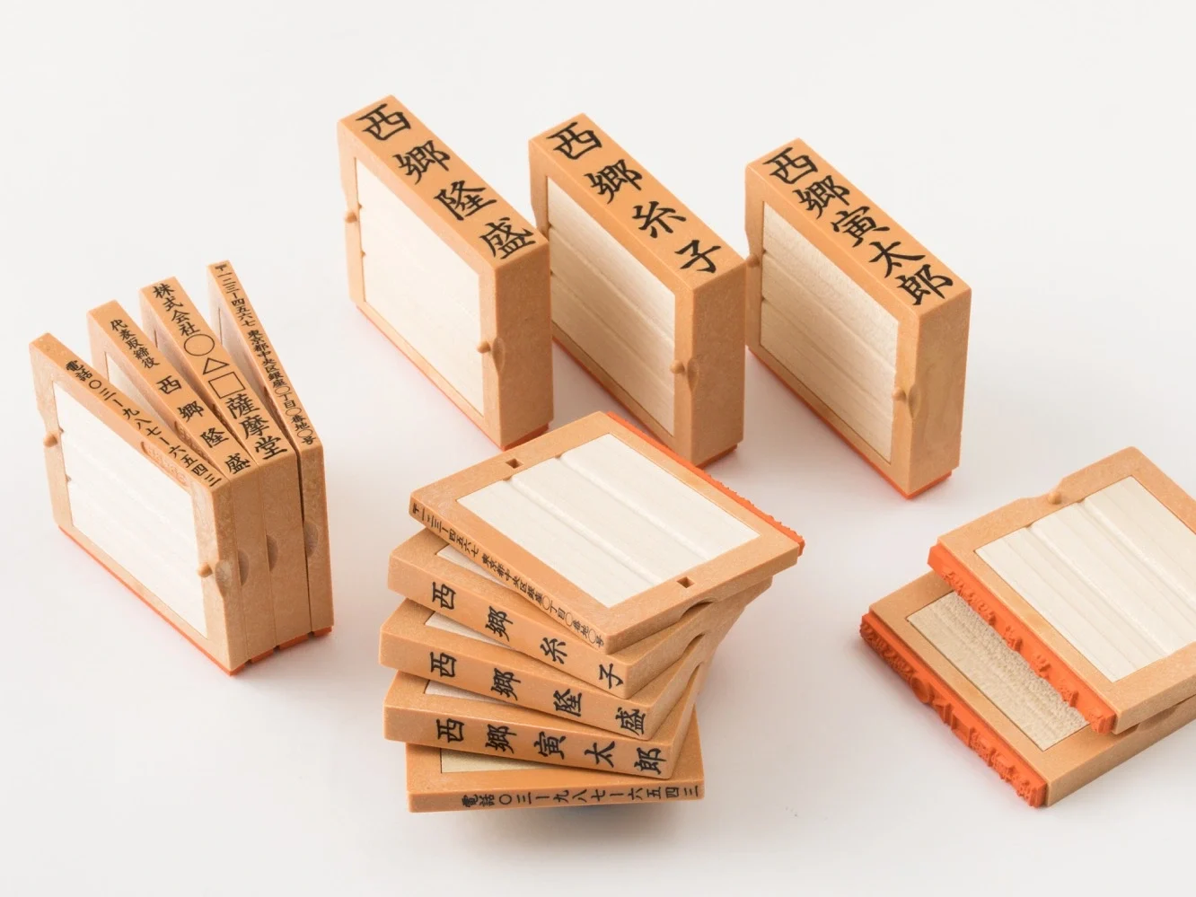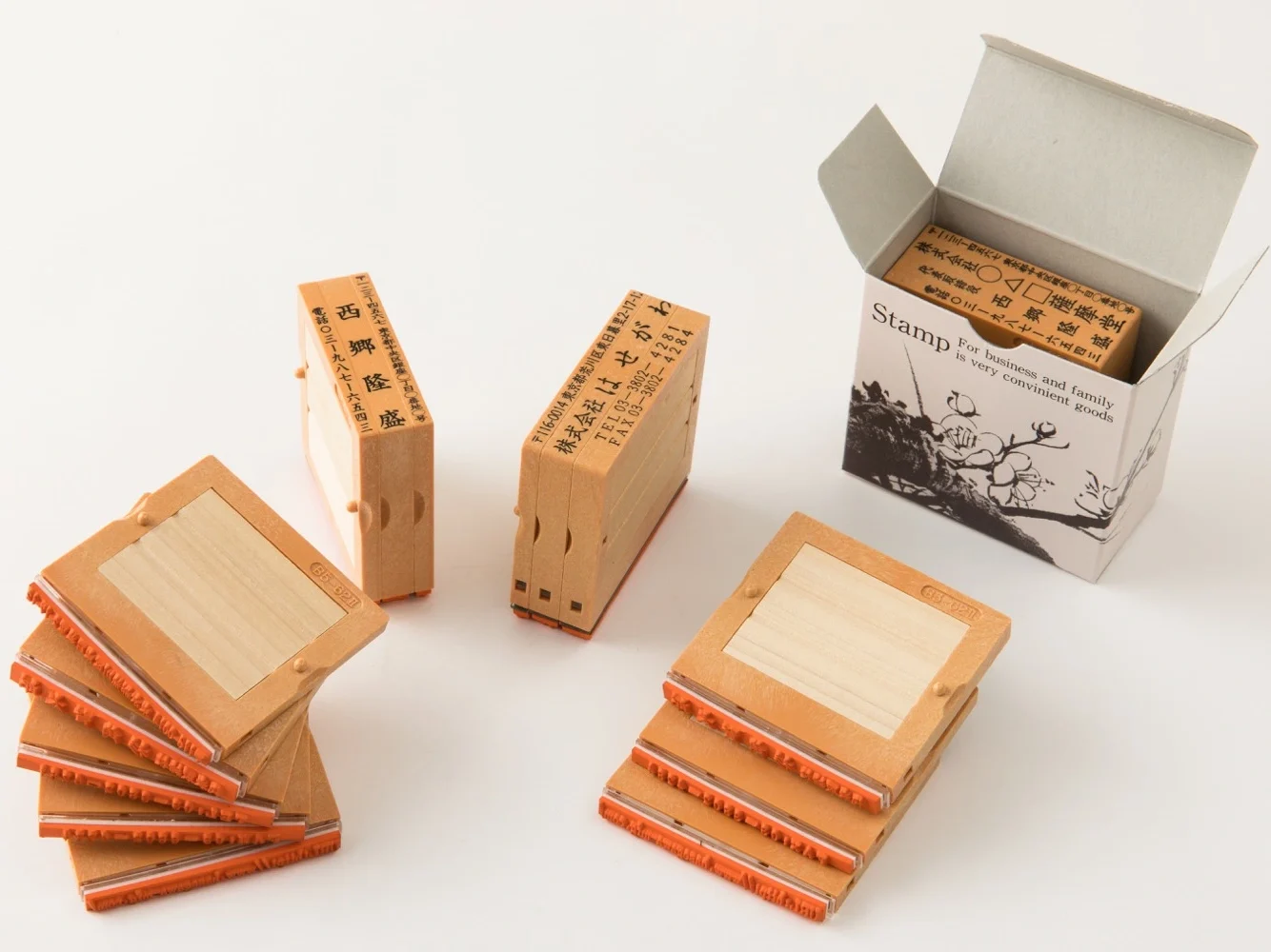 組み合わせる事で個人名、会社名、住所、電話、Eメール等、状況に合わせた押印が自由に可能です。中心部に天然木材を使用し、優しい手触りが魅力です。外枠はプラスチック(PS)を使用し、反りの心配はありません。