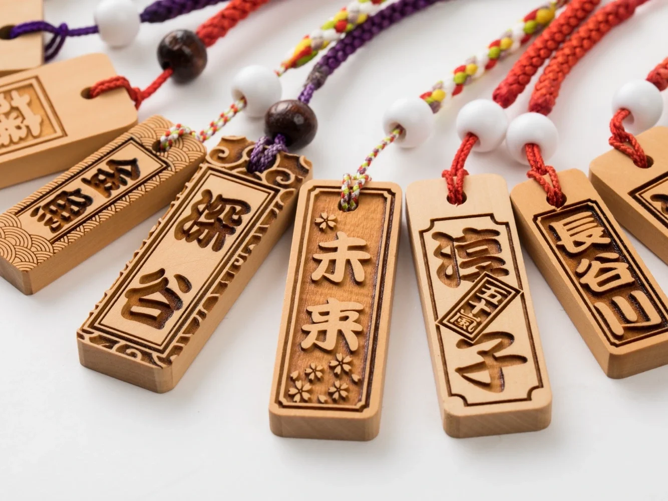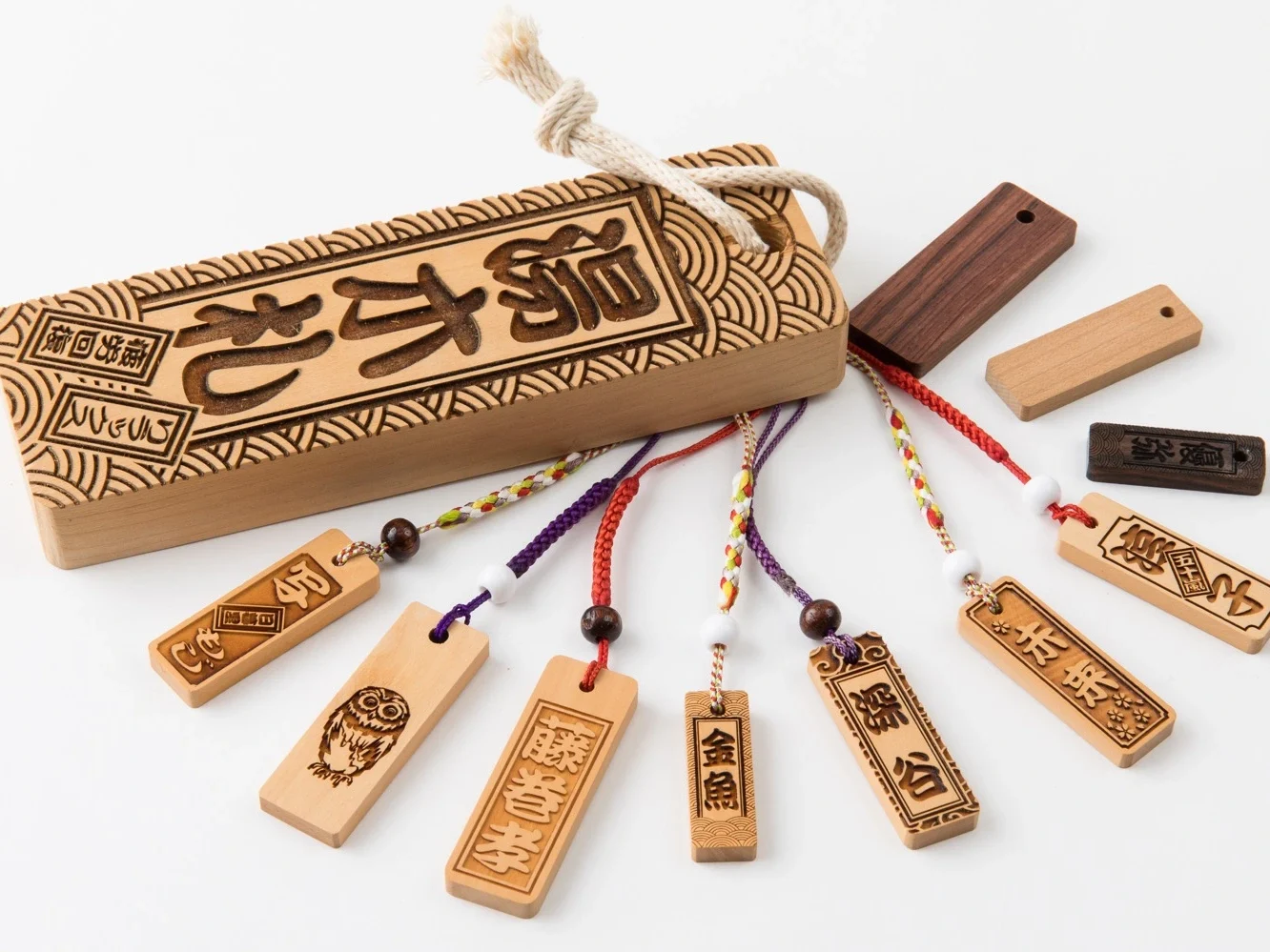 天然木にレーザー彫刻・厚物プリンターによるカラープリントでストラップやアクセサリーの提案は如何でしょうか。付属品の根付・白玉等も取り扱っております。更には絵馬の天然木加工も承っております。