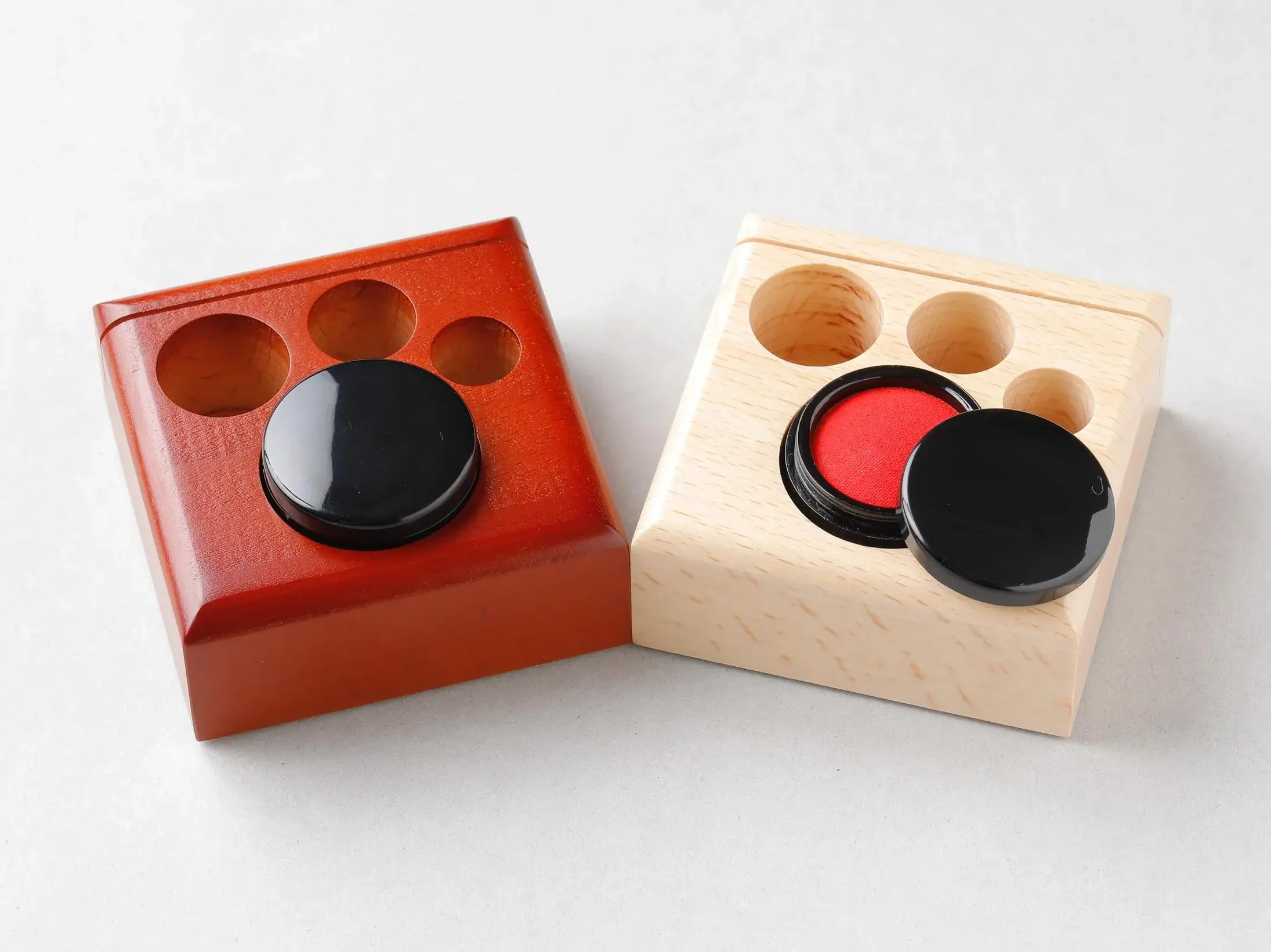 天然木を贅沢に使用した朱肉付きのハンコスタンドです。使用頻度の高い浸透印も立てられます。14mm・17mm・21mm丸にはお気に入りの印鑑・スタンプを、メッセージカードも立てられます。お祝い品、プレゼントにも嬉しい化粧箱入りです。